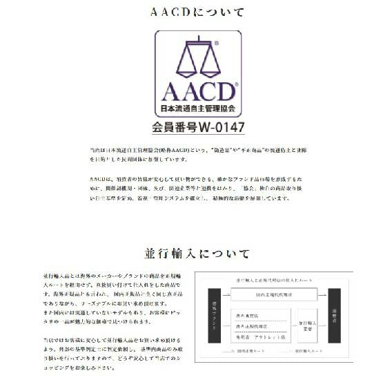 弊社の扱う商品は並行輸入品です。 海外基準で検品された商品が入荷するため、海外での保管状況によってはキズや汚れ等が見受けられる商品がある場合もございます。 海外から直接買い付けて仕入れをしていることや、上記で述べた理由のため、正規品でありながらリーズナブルにお買い求めいただけます。